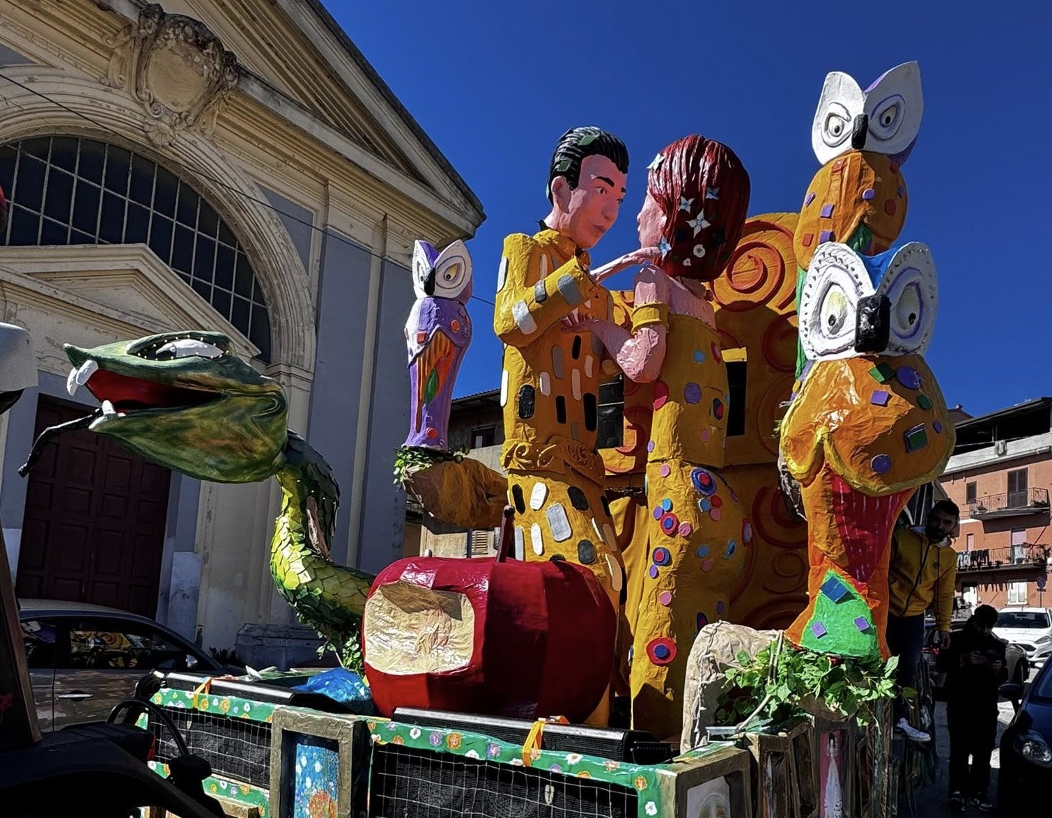 Il carro allegorico si è imposto per forza visiva e profondità concettuale. Una vera e propria installazione scenografica, capace di fondere simbologia biblica e suggestioni artistiche ispirate all’universo decorativo di Gustav Klimt.