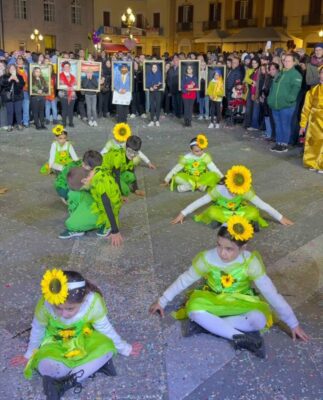 Il gruppo mascherato “Dove fiorisce l’arte” ha trasformato la sfilata in un vero spettacolo vivente. In primo piano, bambine vestite di verde brillante, impreziosite da grandi girasoli tra i capelli e applicazioni floreali sugli abiti, hanno incarnato l’idea di un’arte che germoglia, cresce e illumina la comunità. Il girasole, simbolo di luce, energia e vitalità, ha conferito leggerezza e luminosità all’intera coreografia.